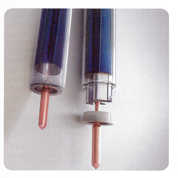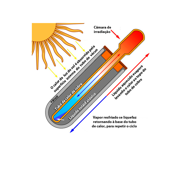 O tubo de cobre faz a condução do calor que existe dentro do tubo de vácuo até a ponta que tem ligação ao coletor por onde percorre a água aquecida.